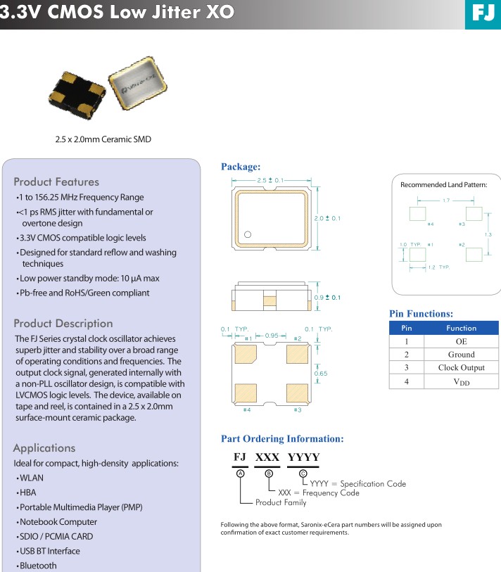 FJ系列晶體時鐘振蕩器實現卓越的抖動和穩定性在廣泛的范圍操作條件和頻率。輸出時鐘信號,內部產生一個非鎖相環振蕩器設計,是兼容的LVCMOS邏輯水平。該設備,可在磁帶和卷軸,包含在2.5 x 2.0mm陶瓷表面包。