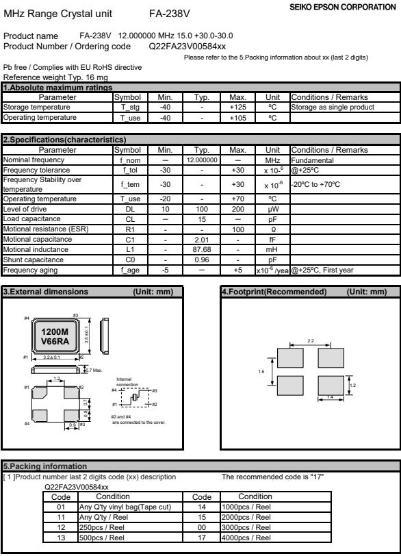 | Q22FA23V0056716 | 3.2 x 2.5 x 0.7mm | FA-238V | 12.000000 MHz | 8 pF | +/-50 ppm | +/-30 ppm | -40 to +85 °C |