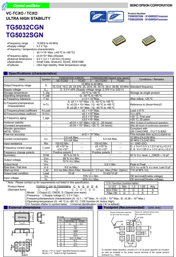 | X1G005231004200 | TG5032CGN | 10.000000 MHz | 5.00 x 3.20 x 1.45 mm | CMOS | 3.135 to 3.465 V | +/-1.0 ppm | -40 to ++85 °C |
