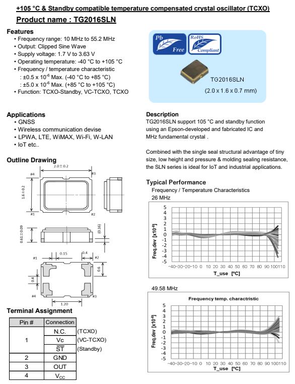 | X1G005731080116 | TG2016SLN | 26.000000 MHz | 2.00 x 1.60 x 0.61 mm | 3.135 to 3.465 V | +/-2.0 ppm | -40 to +105 °C | +/-0.50 ppm |