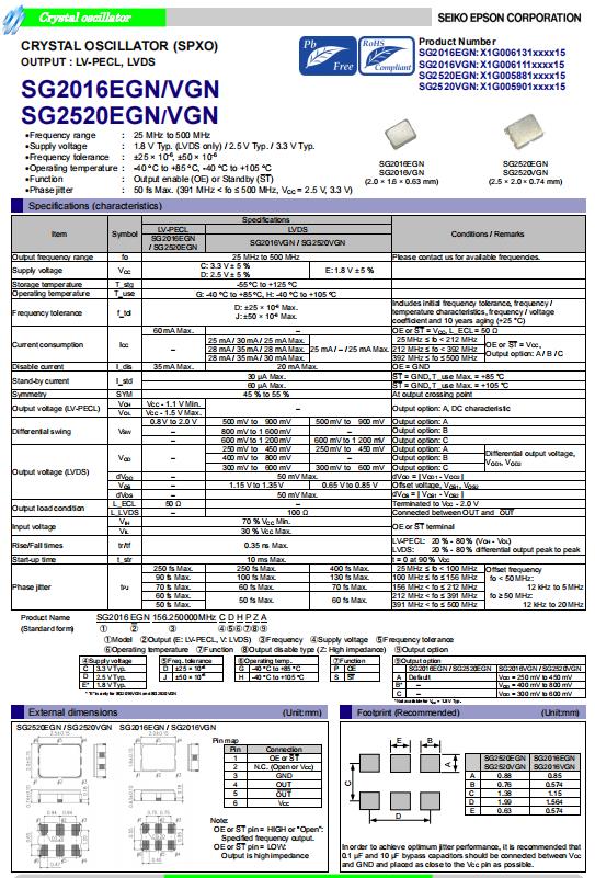 | X1G005941000515 | SG2520VHN | 156.250000 MHz | 2.50 x 2.00 x 0.84 mm | LVDS | 3.135 to 3.465 V | -40 to 105 °C | +/-20 ppm |