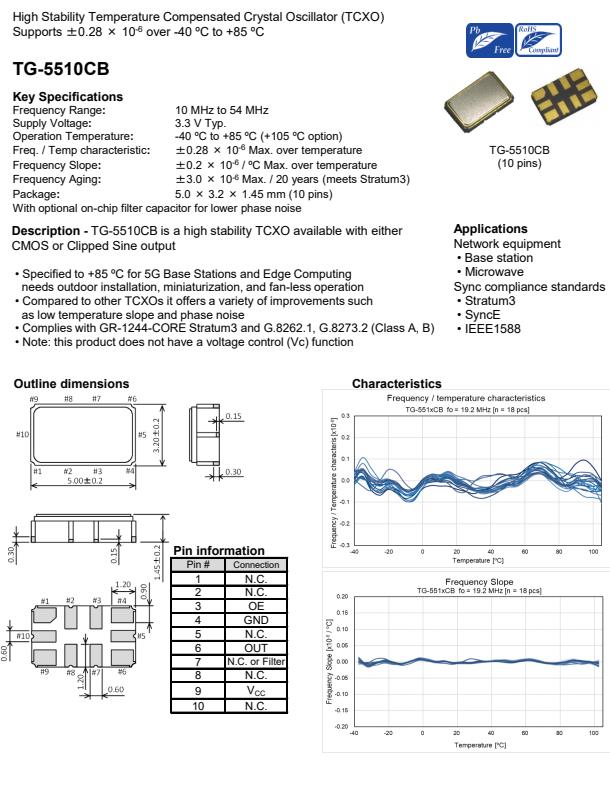 | X1G005241001000 | TG5032SGN | 19.200000 MHz | 5.00 x 3.20 x 1.45 mm | Clipped sine wave | 2.700 to 3.000 V | +/-1.0 ppm | -40 to ++85 °C |