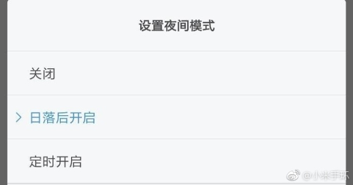 今天,小米手環官方微博放出了一張疑似小米手環APP中的截圖,不出意外的話,應該是小米手環3后續將加入的新功能。 從圖片來看,小米手環3將加入設置夜間模式的功能,可以選擇日落后開啟或自定義時間開啟。