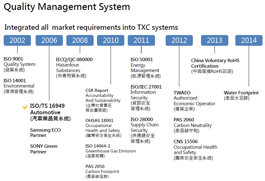 在TXC晶技,質量是全體員工共有的理念,其質量管理體系被設計為確保所有最終端產品都處于有效運作狀態.TXC晶振的質量方針是為我們的客戶提供世界級的產品的承諾.所有TXC晶技公司的產品都通過了ISO-14001和ISO 9001認證,并符合RoHS無鉛(PB)標準.我們的產品也達到了UL94 -旁白對所有使用的環氧樹脂材料的要求,額定氧指數最低為28%.
