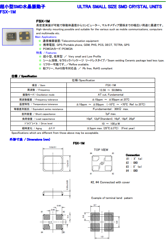 富士晶振,石英晶體,FSX-1M水晶振子.小型表面貼片晶振型,是常用的石英晶體諧振器,適用于寬溫范圍的電子數碼產品,家電電器及MP3,MP4,播放器,單片機等領域.可對應8.000MHz以上的頻率,在電子數碼產品,以及家電相關電器領域里面發揮優良的電氣特性,滿足無鉛焊接的回流溫度曲線要求.