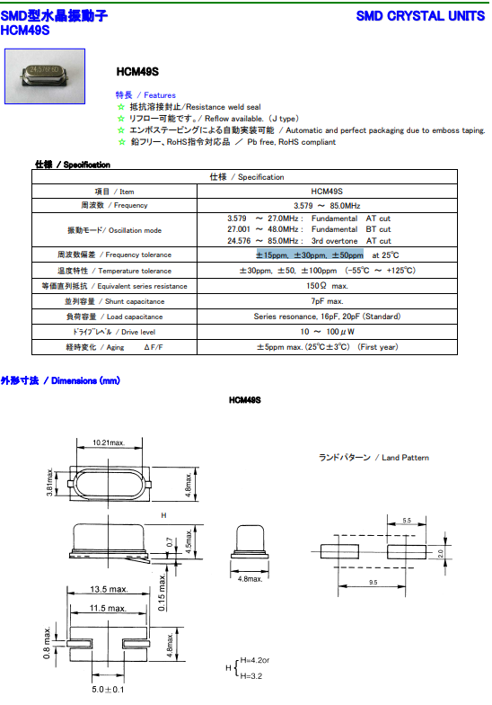 富士晶振,49/S晶體,HCM49S水晶振子.49S型具有穩定的起振特性,高耐熱性,耐熱循環性和耐振性等的高可靠性能,由于在49/S形晶體諧振器的底部裝了樹脂底座,就可作為產品電氣特性和高可靠性無受損的表面貼片型晶體諧振器使用,滿足無鉛焊接的回流溫度曲線要求.