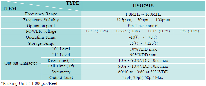 加高電子晶振,HSO751S有源晶振,石英晶體振蕩器,尺寸大小5.0*7.0*1.4mm,CMOS輸出晶體振蕩器,頻率范圍1.8 to 160.0MHZ,工作溫度-10~+70℃耐高溫環(huán)境,三態(tài)函數(shù)應(yīng)用于視覺的產(chǎn)物,該款SMD振蕩器主要應(yīng)用于:PCMCIA卡,CCD,便攜式電,無線局域網(wǎng).