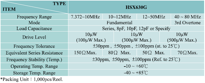 HSX630G諧振器,6035mm陶瓷面晶振,加高晶振型號,尺寸大小6.0*3.5*1.2mm,頻率范圍7.372 to 80.0MHZ,工作溫度-10~+60℃耐高溫環(huán)境,精度高和可靠性的熱量阻力,適合各種應(yīng)用程序,常見臨時轉(zhuǎn)換解決方案便攜式消費設(shè)備,選擇性浸式時鐘臨時解決方案,設(shè)計要考慮切換到SMD類型生產(chǎn).