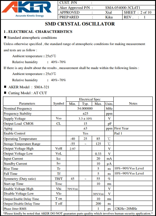 | 頻率 | 54MHz | 負(fù)載 | 15pF | 溫度范圍 | -40~ +85℃ |