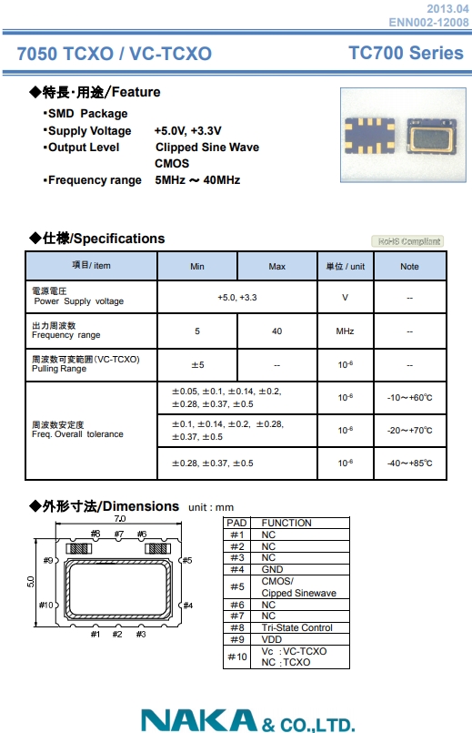 NAKA晶振,VC-TCXO晶振,TC700進口晶振.壓控溫補晶振具有適合于移動通信設備用途的高穩定的頻率溫度特性.為對應低電源電壓的產品.(可對應DC+1.8V±0.1V to+3.2V±0.1V )高度:高1.0 mm,體積:0.007 cm3,重量:0.024g,小型,輕型.低消耗電流,表面貼片型產品.(可對應回流焊)無鉛產品.滿足無鉛焊接的回流溫度曲線要求.