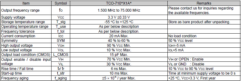 “TCO-7106X1A4 25.0000M3”當把石英共振子與振蕩線路或集成電路(IC)一起整合在一個封裝內, 由外部提供電源電壓, 形成一個主動組件輸出頻率信號, 就是所謂的石英晶體振蕩器. 石英晶體振蕩器可以藉由單一封裝組件內部不同的振蕩線路及輸出線路, 提供不同特性需求的參考頻率(reference frequency). 例如有 石英頻率振蕩器SPXO ( Simple Package Crystal Oscillator ) 或稱為 CXO ( Clock Crystal Oscillator ), 可程序化石英晶體振蕩器PCXO ( Programmable Crystal Oscillator ), 電壓控制石英晶體振蕩器VCXO ( Voltage Controlled Crystal Oscillator ), 溫度補償石英晶體振蕩器TCXO ( Temperature Compensated Crystal Oscillator ) 及 恒溫槽控制石英晶體振蕩器OCXO ( Oven Controlled Crystal Oscillator ).