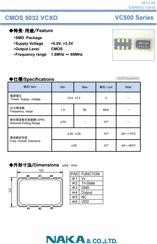 NAKA晶體,VCXO晶振,VC500壓控振蕩器.有源貼片石英晶振外觀使用金屬材料封裝的,具有高穩定性,高可靠性的NAKA晶振,晶振外觀本身使用金屬封裝,充分的密封性能,可確保其高可靠性,采用編帶包裝,外包裝采用朔膠盤,可在自動貼片機上對應自動貼裝等優勢.