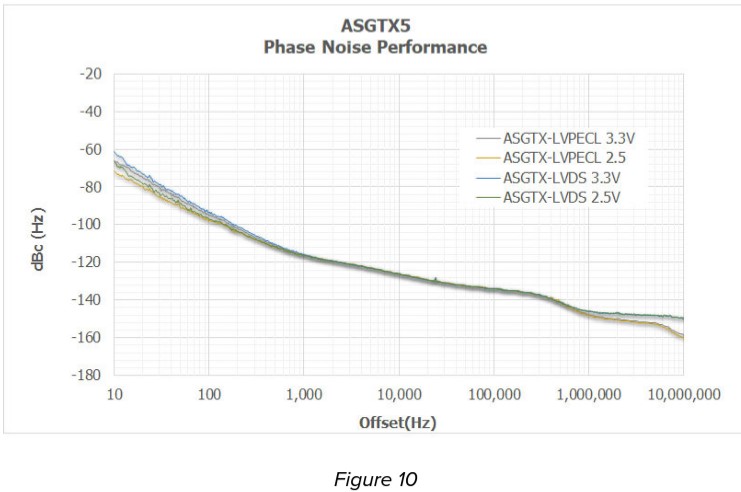 圖10總結(jié)了具有LVPECL和LVDS輸出格式的ASGTX5 TCXO晶振[5.0 x 3.2 x 1.5 mm]器件在所有可用Vdd電平下的典型相位噪聲性能。
