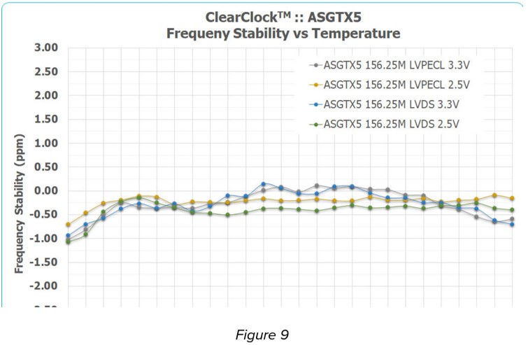 盡管規(guī)定了在-40以上±3.0 ppm的保證最大誤差?C至+85?C、 ASGTX5器件在這個(gè)擴(kuò)展的工作溫度范圍內(nèi)通常保持優(yōu)于±1.0ppm的精度。下圖9概述了ASGTX5器件在156.25MHz載波下的溫度穩(wěn)定性性能。