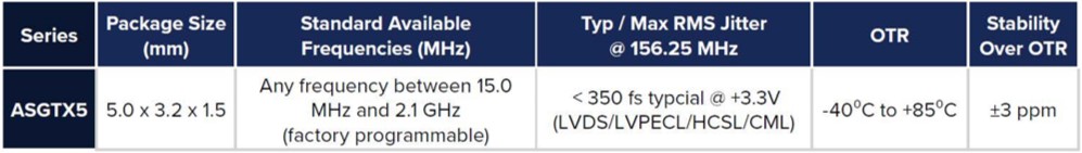 編碼ASGTX5PAD1-156.2500T2,ASGTX5系列采用5.0x3.2x1.8mm SMT封裝,超過了Stratum IV要求的±32 ppm全包穩(wěn)定性。即使有內(nèi)置的溫度補(bǔ)償,該系列設(shè)備在156.25MHz載波下也表現(xiàn)出典型的RMS抖動性能<350fs。此外,ASGTX5有四種標(biāo)準(zhǔn)差分輸出格式(LVDS、LVPECL或CML),載波頻率在15MHz和2.1GHz之間,HCSL格式最高可達(dá)700MHz。該系列非常適合需要嚴(yán)格頻率精度、高載波頻率[如1.00GHz]或CML差分輸出的系統(tǒng)。