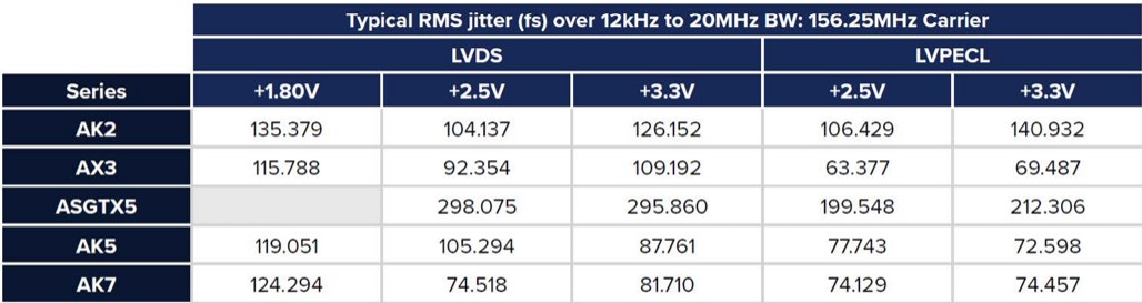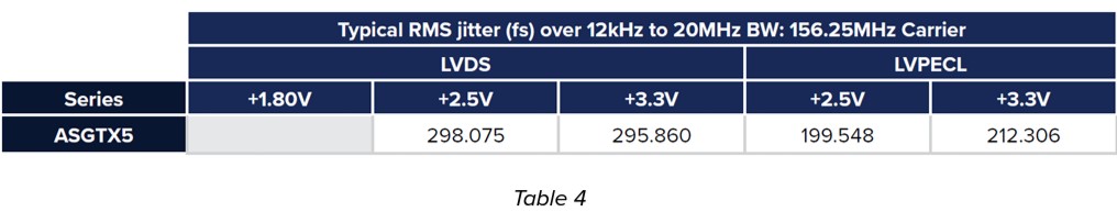 盡管ASGTX5是一種溫度補(bǔ)償解決方案,但Abracon已經(jīng)制定了特定的設(shè)計(jì)技術(shù)來保持卓越的RMS抖動性能,如下表4所示。