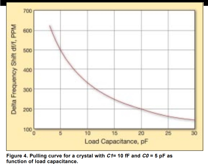 點fs到某個負(fù)載電容CL。等式2的曲線為 稱為晶體的提拉曲線,如圖4所示。從 等式2可以看出,C1越大,距離越大.