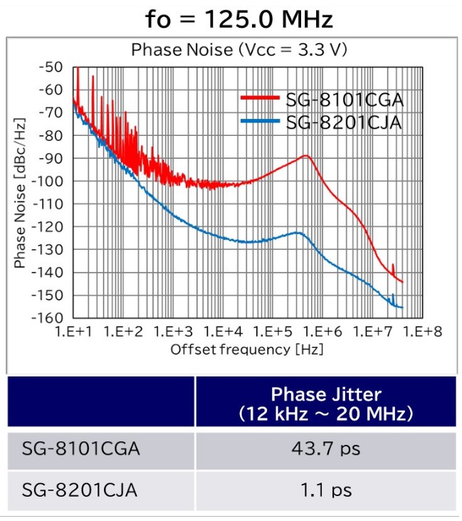 與現(xiàn)有的SPXO SG-8101CGA相比,在100 kHz至1 MHz的偏移頻率下,相位噪聲改善了約30 dBc/Hz,相位抖動降低至約1/40。SG-8201CJA通過降低噪聲水平來降低抖動。它有助于提高傳感器的探測范圍和分辨率。