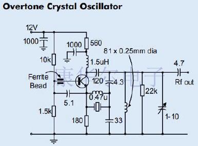 該電路中的晶體直接連接在晶體管的基極和地之間.由于晶體管的內部電容,電容器C1用于改善反饋.該電容器應盡可能靠近晶體管安裝.晶體管集電極中的LC儲能電路被調諧到晶體的泛音頻率.發射極電阻電容器在工作頻率下必須具有大約90Ω的容抗.電感器L1上的抽頭用于匹配晶體管集電極的阻抗.通常,此抽頭的位置距離線圈冷端約三分之一.陷阱的放置是在穩定性和最大功率輸出之間的權衡.輸出信號取自鏈接耦合線圈L2,并通過變壓器作用進行工作.