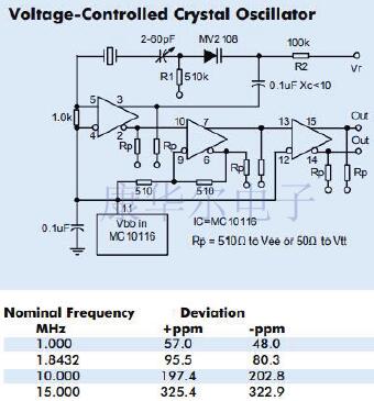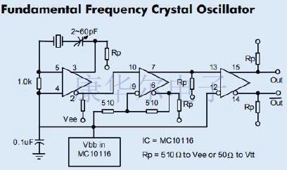 對于低于20MHz的頻率,可以使用基頻晶體,并且不再需要諧振槽.同樣在這個較低的頻率范圍內,典型的MECL10,0002ns的傳播延遲與振蕩周期相比也變小,因此必須使用同相輸出.因此,MC10116振蕩器部分僅用作放大器.1.0kΩ電阻將線路接收器偏置在Vss附近,而0.1µF電容器是Vbb電源的濾波電容器.與晶體串聯的電容器可提供較小的頻率調整.MC10116的第二部分作為施密特觸發器電路連接,可確保從低于20MHz的慢速輸入信號獲得良好的MECL沿.MC10116的第三級用作緩沖器,并提供晶體振蕩器電路的互補輸出.該電路的最大工作頻率約為20MHz,最小約為1MHz.使用基本模式晶體.