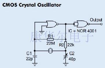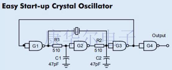 施密特觸發器提供良好的輸出平方,有時甚至不需要額外的輸出級.為防止雜散振蕩,請確保C2=1/1x104(頻率以Hz為單位).